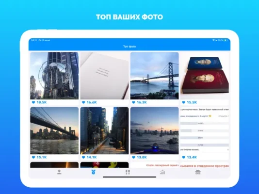 Приложение показывает активность на вашей странице ВК. Смотрите топ Ваших фото, рейтинг и многое другое!