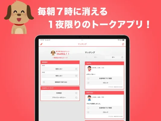 今夜も誰かとチャットしよー( ^∀^)Chatわん!!なら、一晩限定のおしゃべり相手が簡単に見つかります。しかも、毎朝7時にチャット履歴がクリアされるので、色々話しすぎてしまっても安心です。