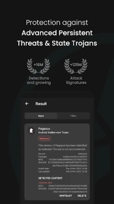 With more than 5 million Android users (as of November 2022), we have 28,458 detections of such APTs (Advanced Persistent Threats) registered, which government organizations & law enforcement agencies widely use.