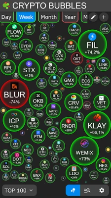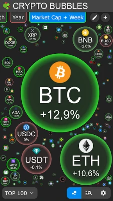 Each bubble represents a cryptocurrency and can easily illustrate different values such as weekly performance or market capitalization through its size, color and content.