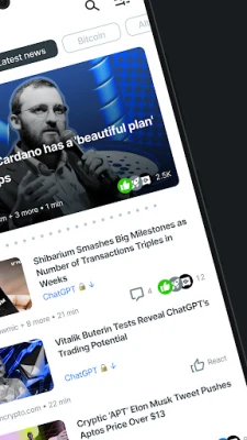 The app provides data on changes in the cryptocurrency market so that Crypto News users always have relevant information about the prices of coins and tokens. Users can find a specific coin by name or ticker: Bitcoin (BTC), Ethereum (ETH), Cardano (ADA), Shiba Inu (SHIB), Solana (SOL),XRP (XRP), Terra (LUNA), Dogecoin (DOGE), Polkadot (DOT), Tether (USDT), BNB (BNB), Polygon (MATIC), Avalanche (AVAX), Cronos (CRO), Decentraland (MANA), VeChain (VET), The Sandbox (SAND), Chainlink (LINK), etc.