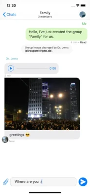 Use Delta Chat with anyone out of billions of people: just use their e-mail address. Recipients will see a simple e-mail and may directly reply with their own e-mail app. They don't need to install Delta Chat, visit websites or sign up anywhere. If you send a picture or other media to a chat group your chat recipients will see a nice regular e-mail with an attachment. If they send a message and attachments back, you will see the media in your chat for this contact.