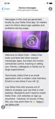 Delta Chat is a messenger that uses the largest, most diverse and decentralized communication system ever created: the existing e-mail server network. Just use your standard e-mail account and start chatting with any of your e-mail contacts, whether they have installed Delta Chat or not.