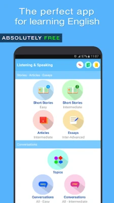 This is a useful English learning app that will help you improve listening skills and speak English confidently and fluently. There are many lessons from basic to advanced built into the app to help you develop every English skill you are looking for and achieve many achievements in learning English.