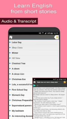 - Thousands of English conversations and stories with audios and completed transcripts;