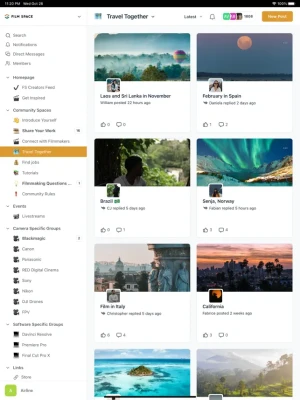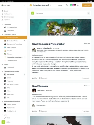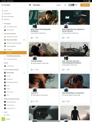 -Discover a huge library of filmmaking related groups such as camera systems, editing softwares and job opportunities. Find filmmakers from specific countries and locations or specific job roles such as Director, Drone Pilot or Camera OP using our straightforward filtering system. Join & choose from a massive collection of spaces that offer personalised topics based on your style of filmmaking.