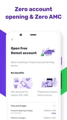 2. Cost-competitive, most affordable pricing in the industry - Pay the lowest brokerage -- 0 Account opening charges, 0 Demat charges (1st year), flat ₹20 Equity (Delivery, Intraday, Future, Options), open demat account in this stock app