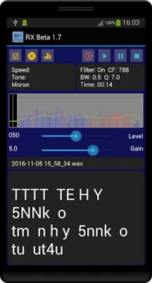 Although there are a number of user adjustable parameters (filter, gain, levels), I have tried to make the decoding as automatic as possible using the start up defaults. This should allow you to simply put your device close to an audio source (radio, WEBSDR, etc.) and see decoded text when a reasonable morse signal is present.
