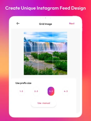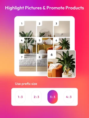 1. You can make 5 type of grids: 3X5, 3X4, 3X3, 3X2 and 3X1 2. Amazing photo collage templates to create unique instagram feed design. 3. App allows you to add fun overlays and different grid styles. 4. You can also apply different colors on overlays and grid styles. 5. Zoom or move your photo 6. App will suggest you ordering so you can easily upload one by one image. 7. Create big pictures and banner pictures on Instagram. 8. Grid Cut is the fast and easy giant square maker