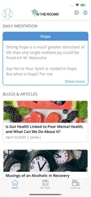In The Rooms is a free, digital meeting website and social network for the addiction recovery community. With over 600,000 members, In The Rooms provides a virtual space for people to connect with others in recovery around the globe. Our community offers support for those in recovery from alcohol or drug addiction, as well as behavioural addictions such as love and relationships, sex and gambling. Our newly-redesigned app gives you recovery at your fingertips, with easy access to virtual meetings, social networking tools, blogs, and recovery guides.