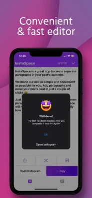 We made our app as simple and convenient as possible for you. Add paragraph, space and line breaks to make your posts neat in just a couple of clicks! Instaspacer is your best ally for your Instagram account.