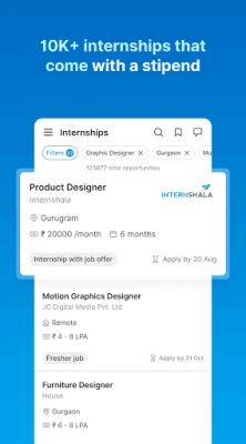 Finding and applying for internships and fresher jobs that you want is now even easier with Internshala's free app for students and freshers. Browse through opportunities offered by 150,000+ companies in various profiles and locations all across India and apply easily to the ones that excite you the most.