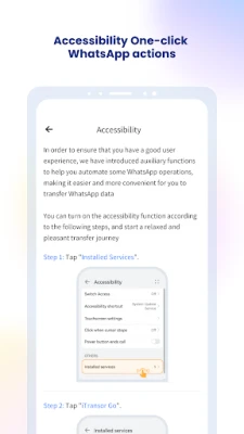 In order to provide you with an easier and smoother WhatsApp data transfer experience, we have come up with an automated accessibility feature. The accessibility function can automatically help you complete WhatsApp backup and turn off WhatsApp two-step verification, and the operation of the accessibility function fully follows the rules of WhatsApp. In addition, we attach great importance to the security of your data, all your data will only be used for transmission, iTransor will not save or share your data with others.