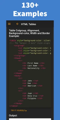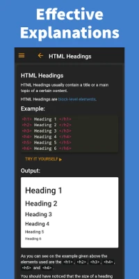 In every lesson, there are explanations, examples with the Try It Yourself functionality that help you effectively learn to code HTML.
