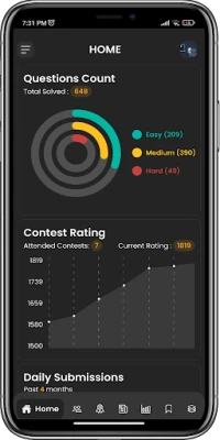 1. Track Your Progress: View your solved problems categorized by difficulty level and monitor your performance in attempted contests with ratings.