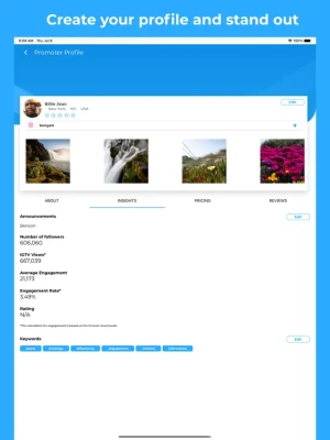 Create and share your profile with a unique vanity URL link to include your availability, background, keywords, prices, add-on services, sponsor history, so you don't waste any time negotiating back-and-forth with sponsors.