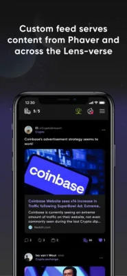 Phaver's decentralized social app brings you the best of Web3 without the complex UX that usually comes along with it. Access the Lens Protocol social graph even without a Lens profile or make your own on-chain posts and follows by connecting your Lens to Phaver. Gamified features help your posts reach more people and reward you with points that will be tradeable for tokens in the future and multi-wallet support allows you to showcase all your coolest NFTs, from Apes to soulbound tokens.