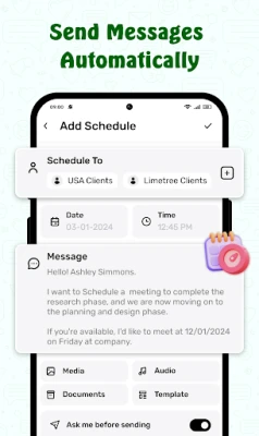 - Schedule Multiple message, text message, media, document with scheduler for WhatsApp