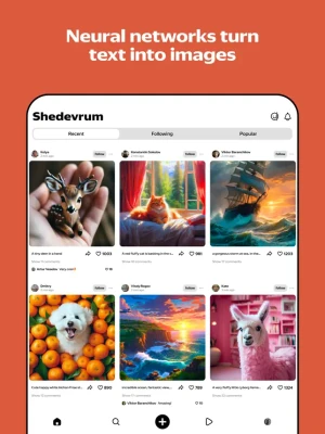 And while the AI is generating your image or text, you can scroll through the feed, comment on other users' posts, and like them. Feed has a few sections: your masterpieces, recent, and the best of the day, the week, or all time. You can save your favorite pictures to your phone.