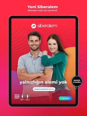 Siberalem Arkadaşlık Sitesi’ne ücretsiz üye olarak milyonlarca üye içinden arama yap, seçtiklerinle tanış, chat yap, sohbet et, arkadaş bul, aradığın aşkı yakala! En iyi arkadaş bulma uygulaması Siberalem’de her gün yüzbinlerce insan bunu yapıyor! Tanışma sitesi Siberalem’in güvenilir platformunda arkadaşını veya aşkı bulmak için uygulamayı kolayca indir ve kısa sürede ücretsiz üye ol!