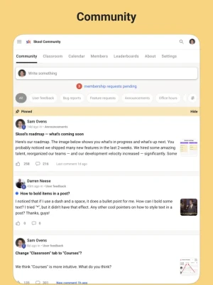 • Community - group discussion with posts and comments • Courses - learn with video and text-based lessons • Calendar - see what community events are happening • Chat - DM anybody in your communities