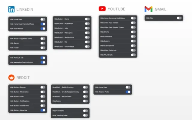 We have identified those parts in each of these websites that grab our attention and serve us unlimited content all day. This extension enables you to hide each of these parts selectively.