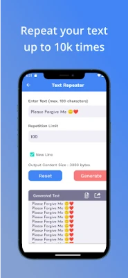 One of the standout features of the Text Repeater app is its ability to repeat text with incredible precision. Need to repeat a specific phrase or word? Simply input your desired text, specify the number of repetitions, and watch how an app generates the repeated text instantly. Whether you're looking to repeat text once, ten times, or even ten thousand times, Text Repeater can handle it all.