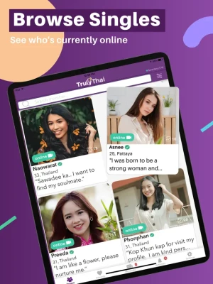 The best Thai dating app. TrulyThai continually connects people throughout the world with Thai singles from Bangkok, Chiang Mai, Phuket, Pattaya, and many other cities in Thailand whenever and wherever. With a large and curated user-base, whether you’re looking for serious relationships or marriage, you’ll surely find your perfect match here.