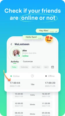 WaLastseen is a very powerful yet simple lastseen Messaging (Whats)App tracker, and you will find it easier than ever to know the activity on Chat (Whats)App, Chat (Whats) App Business, and other apps. With Chat (Whats) App tracker-WaLastseen, you can easily analyze in depth the usage and daily patterns of the one you track and know their lastseen status even they hide their status in Chat (Whats) App. 🤩