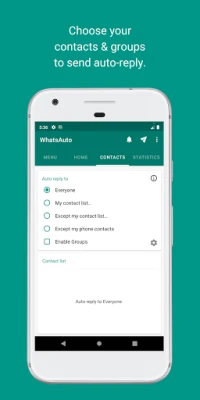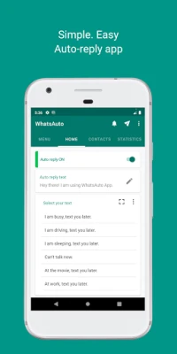 Customise the reply time. You can set WhatsAuto to send auto reply continuously or to send after some time delay or to send only once.