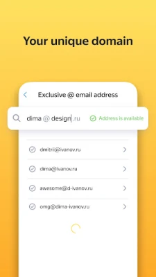 - An exclusive address. Connect Yandex 360 Premium to choose a unique address with your name or what you do. An exclusive address lets people know the line of work you're in. For example: alex@business-design.ru. Your email will stand out and get extra attention.